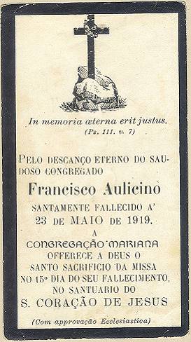 Cartão de luto por Francisco Aulicino, em 23 de maio de 1919, missa da Congregação Mariana no Santuário do Sagrado Coração de Jesus. Coleção Francisco Carballa