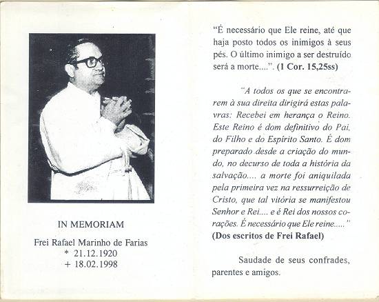 Cartão nacional de luto pelo frei Rafael Marinho de Farias, em 18 de fevereiro de 1998. Coleção Francisco Carballa