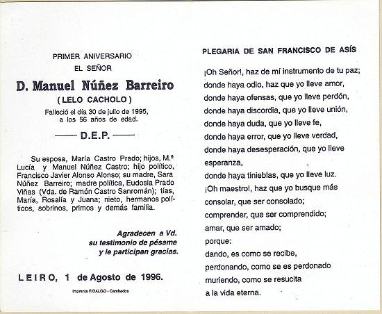 Cartão espanhol de luto por d. Manuel Núnez Barreiro, em 30 de julho de 1995. Coleção Francisco Carballa