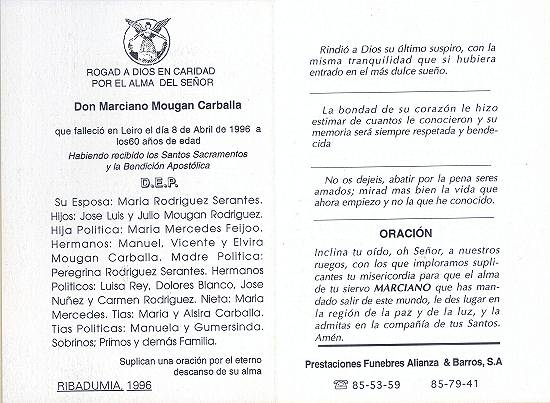 Cartão espanhol de luto por don Marciano Mougan Carballa, em 8 de abril de 1996. Coleção Francisco Carballa