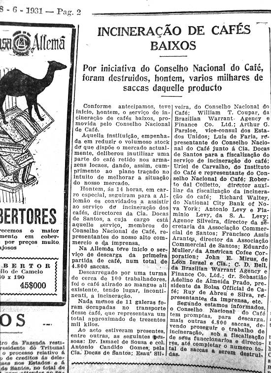Ontem, às 14 horas, em carro especial, seguiram para a Alemão (N.E.: antiga denominação do atual bairro Alemoa, também usada na época) os convidados a assistir ao serviço de incineração dos cafés, diretores da Cia. Docas de Santos, a cujo cargo está aquele serviço, membros do Conselho Nacional de Café, representantes do nosso alto comércio e da imprensa.