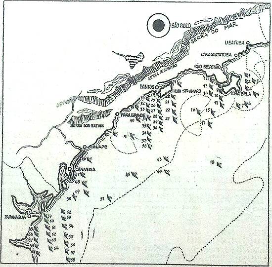 dos Alcatrazes; 23) Minas, rebocador, brasileiro, Porto de Santos; 24) Guararema, 1949, navio brasileiro, a 3 milhas da Ponta do Limão; 25) Eitel Fritz, 9-5-1894, barca alemã, na Baía de Santos; 26) Casco, 1894,