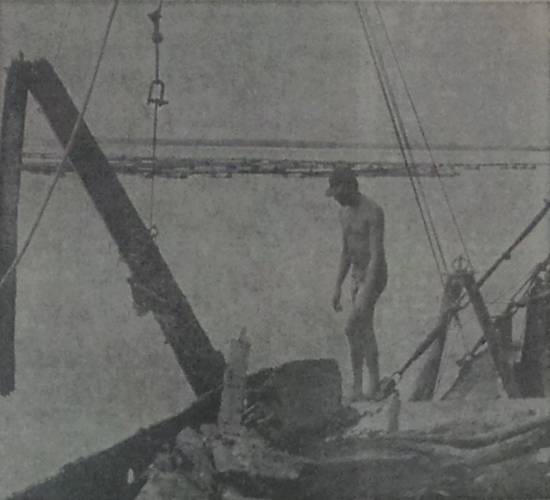 durante os trabalhos de aprofundamento do canal de navegação do porto, conforme relata o jornal santista A Tribuna, na edição de 30 de janeiro de 1974, páginas 1 e 9 (ortografia atualizada nestas transcrições):
