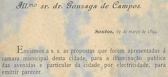 O livrete Illuminação - Estudo para a Municipalidade, escrito por Gonzaga de Campos, com 96 páginas e sem ilustrações, foi impresso no ano de 1899 pela Tipografia da Cidade de Santos (situada no número 35 da Praça Mauá e pertencente ao antigo jornal Cidade de Santos, que circulou na cidade desde 1888 até o início do século XX).