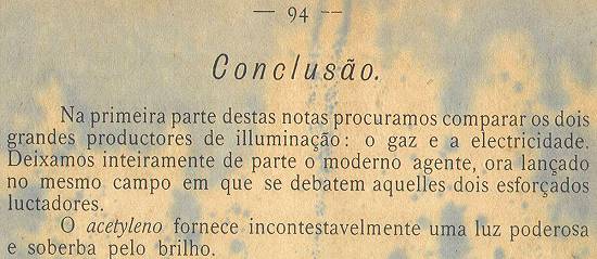 Na primeira parte destas notas procuramos comparar os dois grandes produtores de iluminação: o gás e a eletricidade. Deixamos inteiramente de parte o moderno agente, ora lançado no mesmo campo em que se debatem aqueles dois esforçados lutadores.