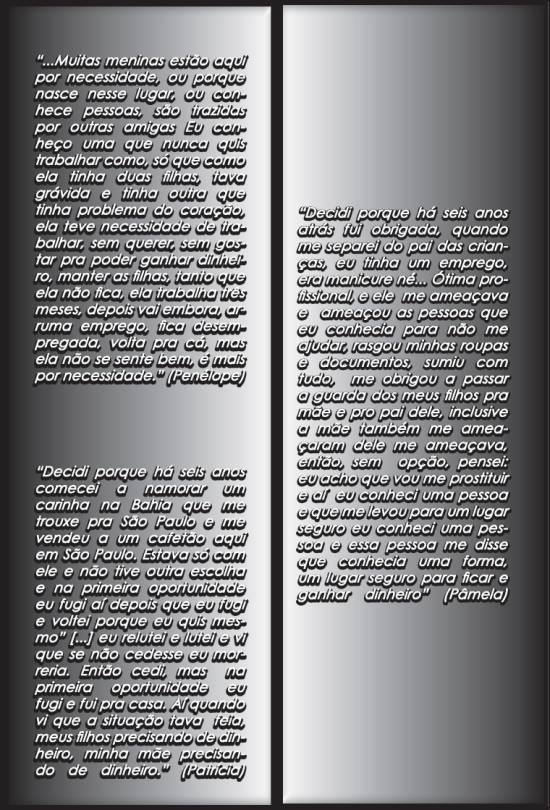 garotas de programa, talvez por pertencerem à uma realidade muito difícil, carregada de tabus e preconceitos, sendo silenciadas pela