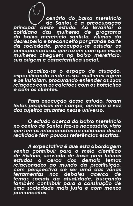 Santos é a preocupação principal deste estudo. Ao levantar o cotidiano das mulheres de programa do baixo meretrício santista, vítimas do