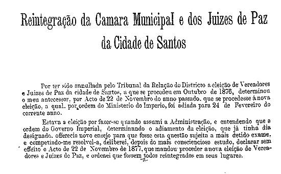 Por ter sido anulada pelo Tribunal da Relação do Distrito a eleição de vereadores e juízes de paz da cidade de Santos, a que se procedeu em outubro de 1876, determinou o meu antecessor, por ato de 22