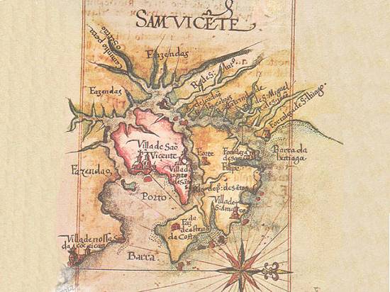 "Sam Vicête" e na ocultação dos pontos extremos do litoral, é este assim descrito "Mapa de São Vicente, de Luiz Teixeira, cerca de 1586":
