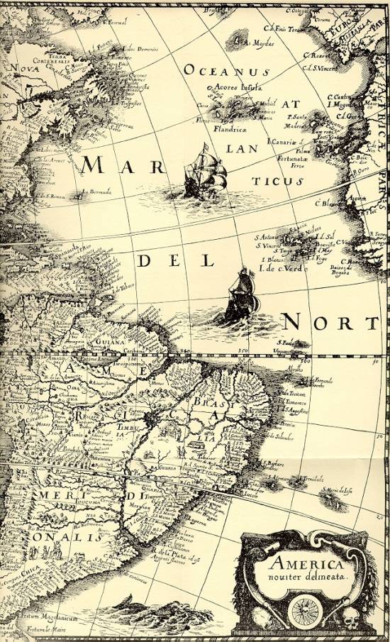 Reprodução do lado direito do mapa das Américas incluído na Historia Antipodum oder Newe Welt, produzida por Mattäus Merian e pelo escritor e compilador Johann Ludwig Gottfried, onde já é citada a vila de São Vicente.