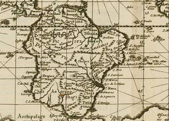 Neste pormenor da imagem acima, observa-se uma América do Sul bastante distorcida em suas formas, e