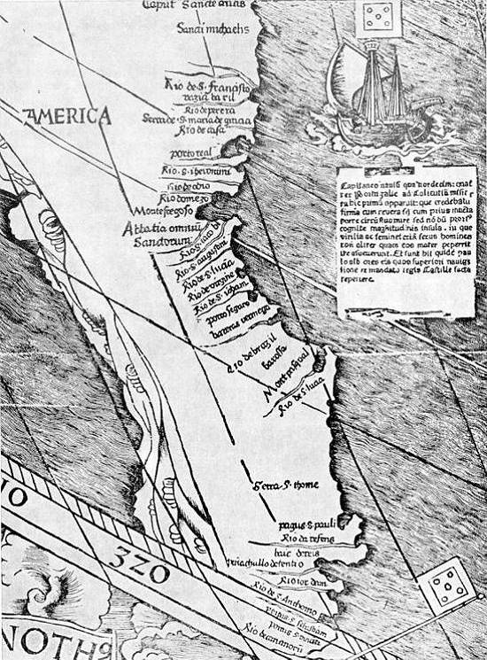 Vespúcio (à direita), cujas informações permitiram detalhar a costa sulamericana, e que assim daria seu nome ao novo continente. Note-se que a passagem