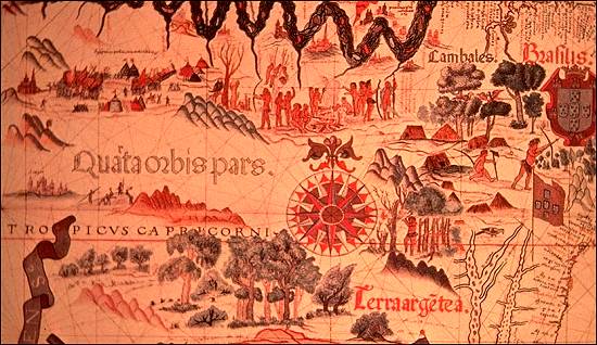 E, de tudo que se contava, o que mais impressionava os europeus era que os índios, estranhas criaturas que não usavam roupas, não tomavam vinho e não praticavam o comércio, assavam e comiam os seus inimigos. Assim, na cartografia, além da preocupação de descrever os acidentes geográficos, os cosmógrafos ilustravam seus mapas com figuras características da terra.