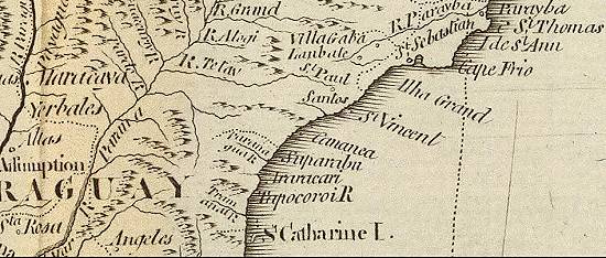 Paraíba do Sul, vendo-se ainda os limites do Paraguai bem próximos do litoral brasileiro: