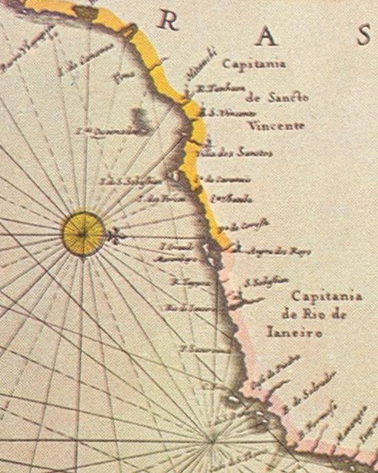 No detalhe desse mapa, a "Capitania de Sancto Vincente", com a "Vila dos Sanctos" e outros indicativos