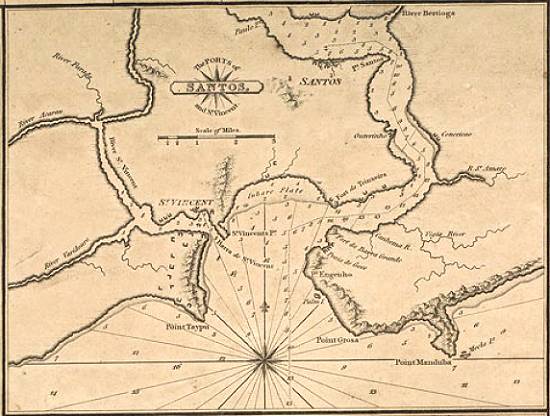 No quadro referente ao porto de Santos, note-se a escala em milhas, o calado (profundidade) medido em pés e ainda o fato de, mesmo num mapa inglês, a extensão da praia santista, marcada por antigos rios, aparece toda ela denominada como "Embaré", tendo na ponta o Forte da Trincheira, que já teve diversos nomes (Forte Augusto, da Estacada ou Fortaleza do Castro), em oposição ao Forte da Barra Grande:
