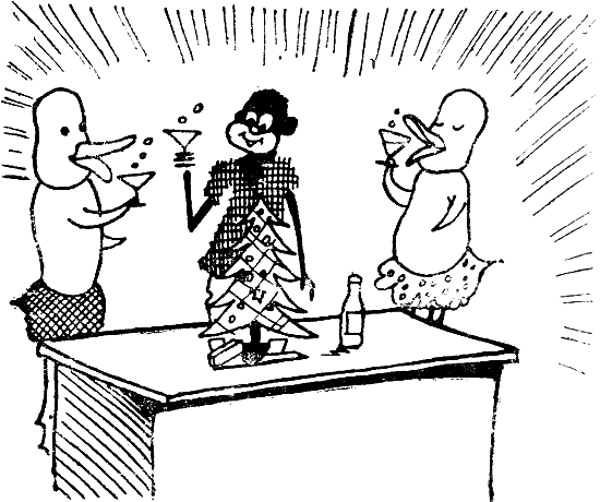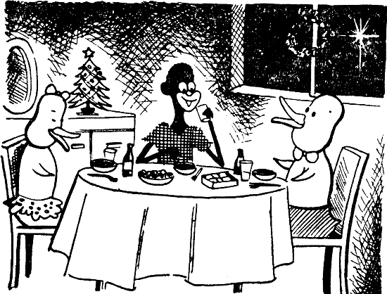 Passaram-se uns dias. Chegou o Natal. As estações de rádio tocavam discos referentes à maior festa da Cristandade. Patolo, contente e feliz por estar bom, deu umas voltinhas. À noitinha, apareceu Jabuca. A mesa estava posta. Uma árvore de Natal, em miniatura, estava armada. Patolo, com muita arte, ajudado pela Patilda, colocou-lhe umas velinhas. Sentaram-se à mesa. A bóia era diferente, reforçada. Dava água na boca... Guaranás estavam dando sopa...