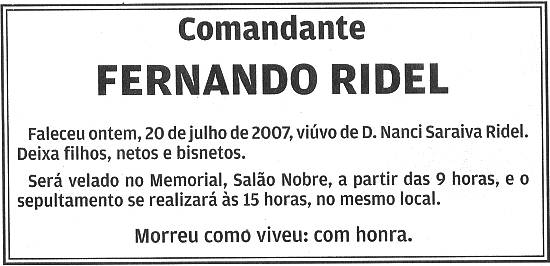 uma parada cardíaca, o ex-prefeito de Santos Fernando Ridel. O ex-comandante da Marinha, que tinha 88 anos, governou a Cidade no período de 15 de