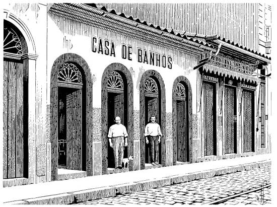 Natural de Vigo, Espanha, onde nasceu em 19 de março de 1840, José Caballero (à esquerda, na reprodução) chegou a Santos com a idade de dez anos, após morar no Rio de Janeiro. Além da casa de banhos e do botequim, possuiu também uma loja de venda de calçados, no número 19 da mesma rua.