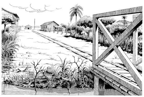 O Gonzaga em 1889: Rua Marcílio Dias, aberta em conseqüência da colocação do último trilho do prolongamento da linha de bondes puxados por burros que ligavam a Vila Matias à praia, pela Avenida Ana Costa. À direita, vê-se a chácara de George Holden, onde morava Antônio Luís Gonzaga, e adiante, na esquina com a praia, o barracão que este construiu e transformou em botequim, conhecido como o Ponto do Gonzaga.