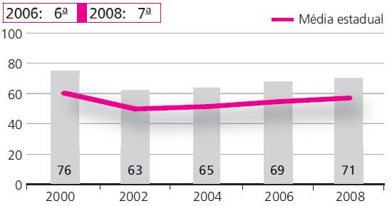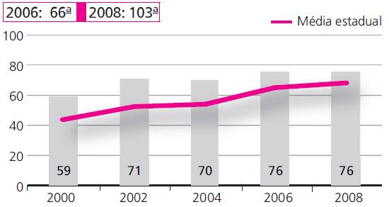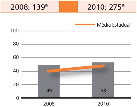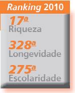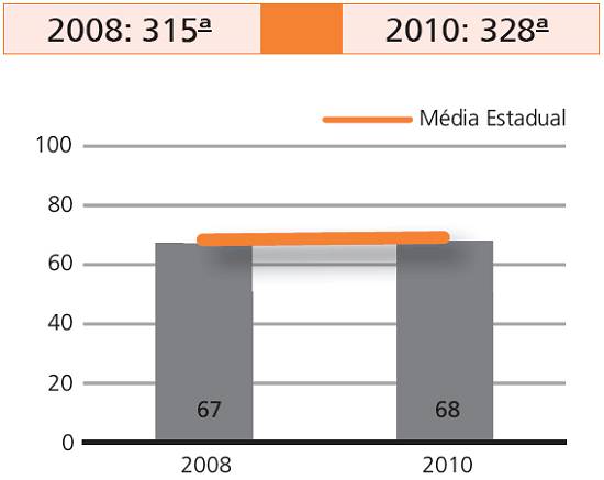 sociais, o escore de longevidade ficou abaixo do nível médio do Estado, enquanto o de escolaridade superou a média estadual.