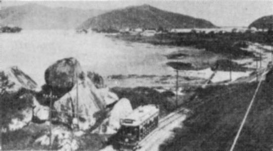 Bonde passa pela Pedra dos Ladrões, em 1915 (a rocha foi depois demolida)