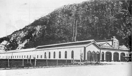 lado das cocheiras da Cia. City em Vila Mathias. Na usina, havia dois motores a vapor de 400 cavalos, e cada um acionava um dínamo de 550 Volts em