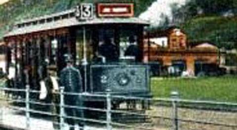 bonde em 1909: à direita do bonde, vê-se o vapor da usina em funcionamento