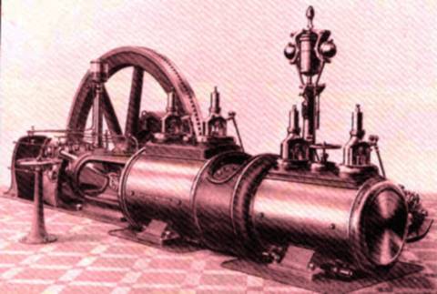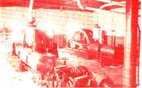 Os motores a vapor e dínamos em funcionamento em 1900, quando da inauguração dos bondes em São Paulo (fonte: "História da Light", Edgard de