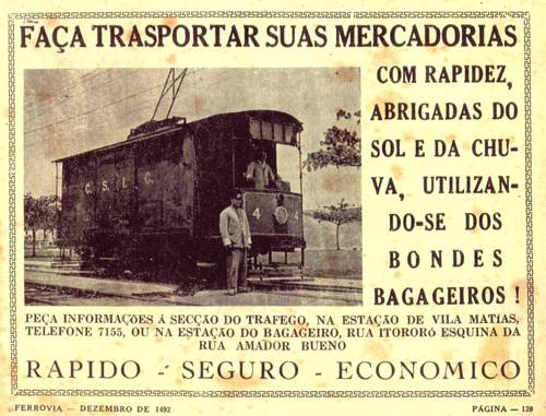 na revista Ferrovia. A imagem superior ("O velho amigo do santista") saiu na edição 62, de janeiro de 1941. O anúncio mostrado a