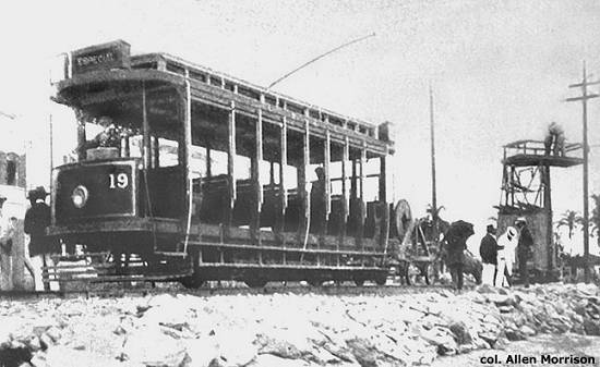 Abaixo, outra foto daquele artigo da T&RW publicado em 1914. Mostra o mesmo bonde 19 durante a instalação da rede aérea: