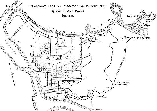 Mapa das linhas de bondes de Santos e S. Vicente, em inglês, de meados do século XX
