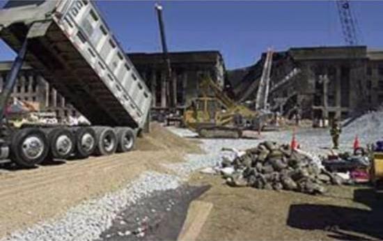 areia em cima do jardim do Pentágono. Logo atrás vemos um trator espalhando cascalho e pedra britada sobre o gramado.