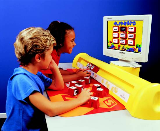 computador, mais de 150 cubos vermelhos e amarelos – cada um com uma letra – e um CD-ROM, que contém o programa responsável pelo