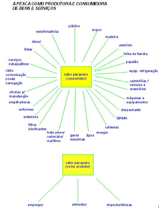 O setor pesqueiro no Brasil representa aproximadamente 0,4 % do PIB. Considerando-se toda a sua cadeia produtiva (figura 2), incluindo a produção de rações, transportes, processamento e treinamento, essa participação alcança 2% do PIB. A produção deverá ser incrementada principalmente com a expansão da pesca oceânica (SEAP, 2003).