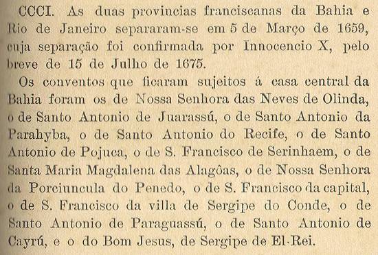 – As duas províncias franciscanas da Bahia e Rio de Janeiro separaram-se em 5 de março de 1659, cuja separação foi confirmada por Inocêncio X,