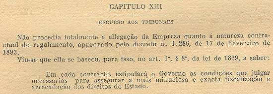 referentes, de um termo de contrato, por ambas as partes firmado; e simples regulamento, não podia proceder-se com o de 1893 do mesmo modo. Ademais, pela cláusula 2ª do referido regulamento, ficava a empresa sujeita "a todas as responsabilidades,