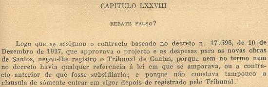as novas obras de Santos, negou-lhe registro o Tribunal de Contas, porque nem no termo, nem no decreto, havia qualquer referência à lei em que se amparava, ou a contrato anterior de que fosse subsidiário; e porque não constava tampouco a cláusula