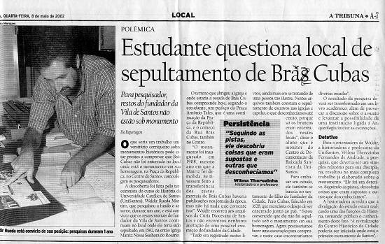 santista A Tribuna, em 8 de maio de 2002, sobre o então estudante universitário Waldir Rueda e sua pesquisa relativa a