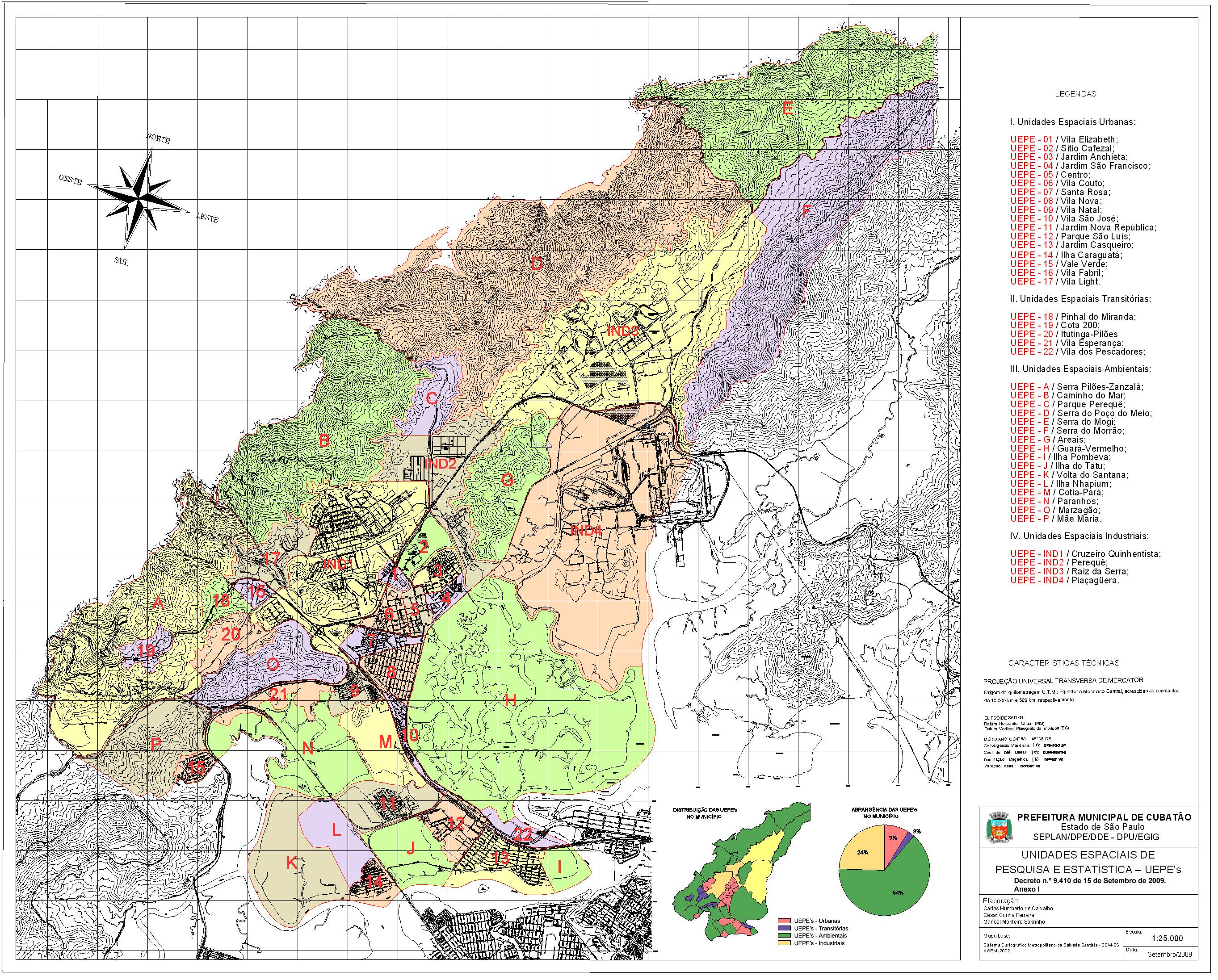 9.410/2009, que estabelece a nova divisão administrativa de Cubatão para efeitos de pesquisa e estatística, criando as Unidades Espaciais de Pesquisa e Estatística - UEPEs -, com base no trabalho apresentado por Novo Milênio em junho (abaixo), que passou apenas por pequenos ajustes técnicos e de nomenclatura.