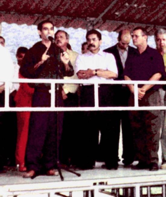 Assinatura do contrato para remoção dos moradores da favela Jardim São Marcos, pelo então ministro das Cidades, Olívio Dutra, tendo ao lado o prefeito Clermont Castor, em 27/3/2004