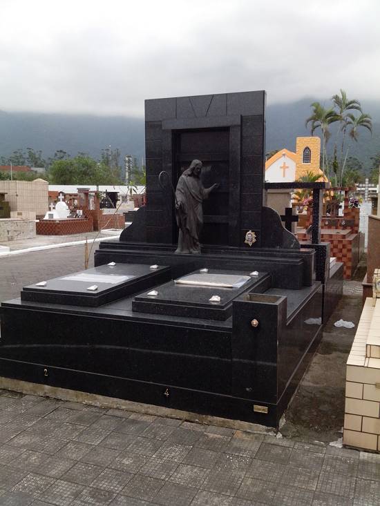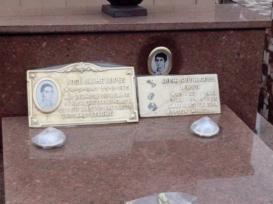 balas, flores e brinquedos como agradecimento por graças alcançadas. Logo na entrada, estão as campas do primeiro prefeito de Cubatão, Armando Cunha (campa 4/solo 1) e do ex-prefeito José Rodrigues Lopes (campa 1.198/solo 126). Já o ex-prefeito