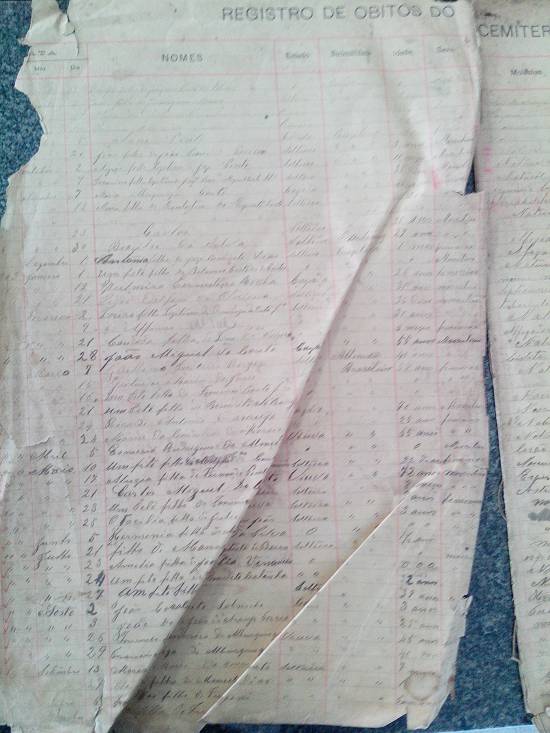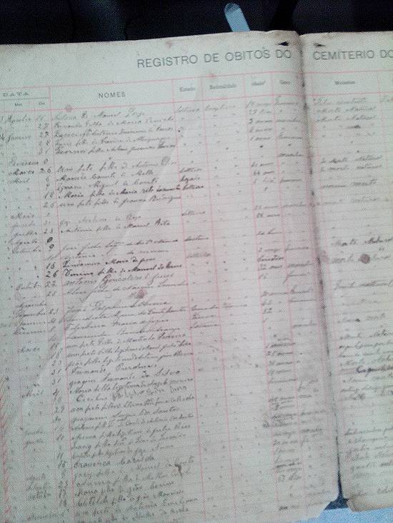 guarda em uma caixa de madeira as folhas do primeiro livro de registros de sepultamentos, que espera ver um dia restaurado pelo valor histórico das informações nele contidas.