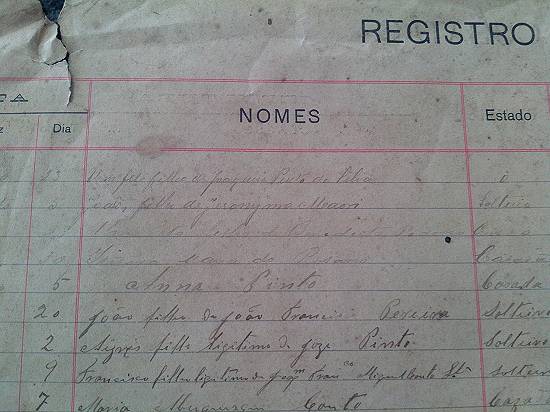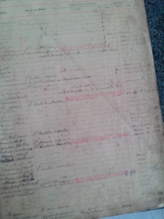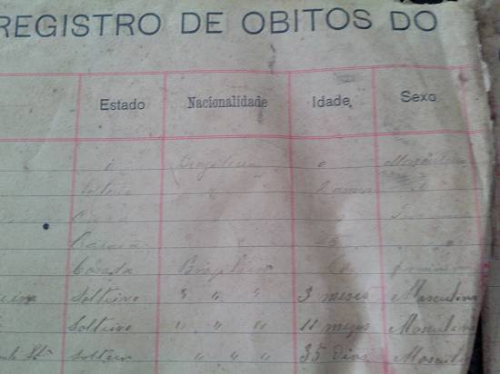 primeiro sepultamento, de um feto, filho de Joaquim Pinto da Silva, nacionalidade brasileira, sexo masculino, morreu ao nascer sem assistência médica