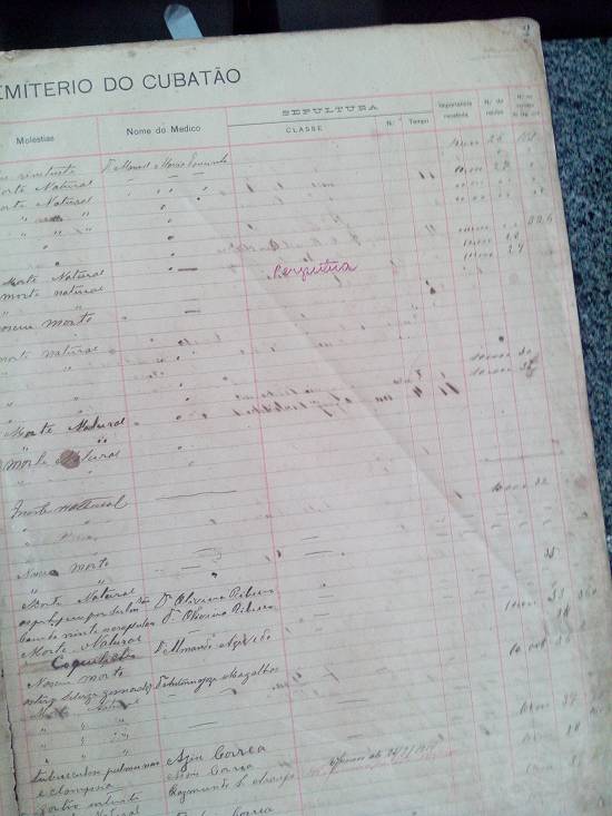 Primeira folha do registro de óbitos com sepultamento no Cemitério de Cubatão: primeiros registros são de 1902: em 23 de julho daquele ano ocorreu o