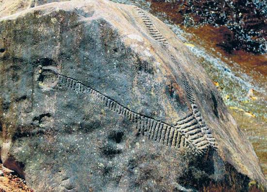 Mas o que chama mais atenção é uma grande pedra que fica a poucos metros do ponto de captação. Nela foi talhado um desenho que se assemelha à espinha de um peixe. Esse registro é considerado por arqueólogos como resquícios de gravuras rupestres.