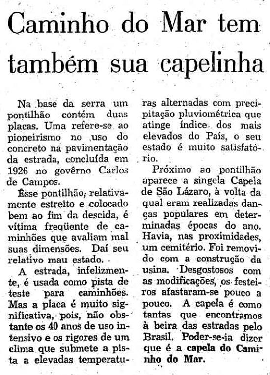 construção da usina. Desgostosos com as modificações, os festeiros afastaram-se pouco a pouco. A capela é como tantas que encontramos à beira das estradas pelo Brasil. Poder-se-ia dizer que é a capela do Caminho do Mar.