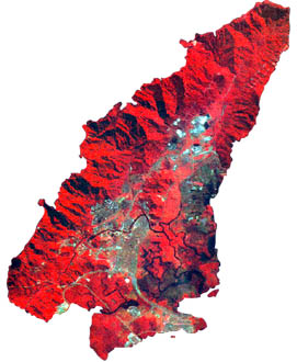 Cubatão, em imagem de satélite: as áreas em vermelho representam vegetação