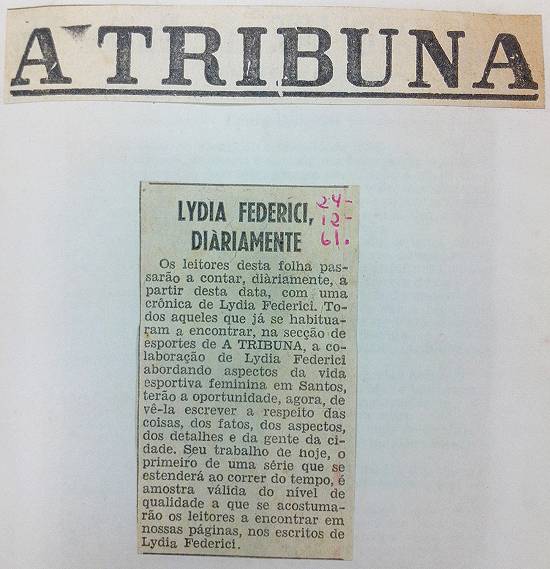 Os leitores desta folha passarão a contar, diariamente, a partir desta data, com uma crônica de Lydia Federici. Todos aqueles que já se habituaram a encontrar, na seção de esportes de A Tribuna, a colaboração de Lydia Federici abordando