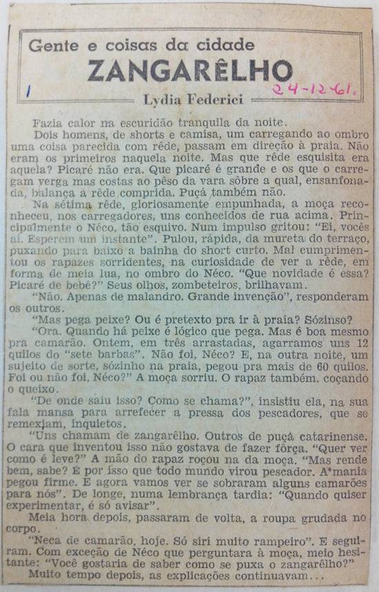 "Uns chamam de zangarêlho. Outros de puçá catarinense. O cara que inventou isso não gostava de fazer força. "Quer ver como é leve?" A mão do rapaz roçou na da moça. "Mas rende bem, sabe? É por isso que todo mundo virou pescador. A mania pegou